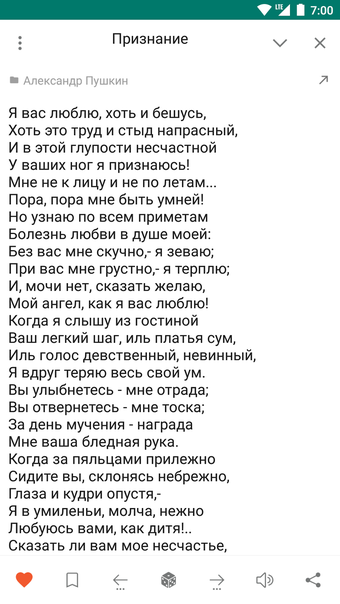 Стихи русских поэтов är en app som erbjuder en omfattande samling av över 19,000 dikter från 260 ryska poeter, inklusive kända namn som Alexander Pushkin och Vladimir Mayakovsky. Appen är utformad för att vara effektiv och snabb, med möjligheter till hög hastighetssökning och olika sökfilter för att underlätta användarupplevelsen. Användare kan även njuta av en funktion för att lyssna på dikterna med hjälp av Text-to-speech-teknik, samt en nattläge för enklare läsning i svagt ljus.